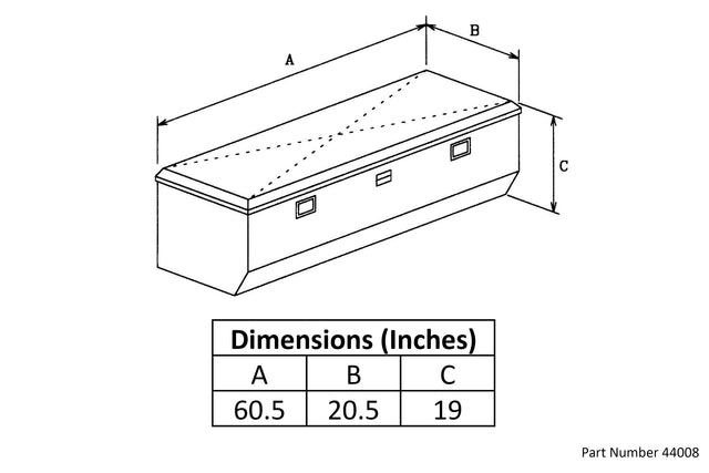 Garrison Series Low-Profile Truck Tool Chest are made of thick, beautiful, polished, diamond tread aluminum, which won't rust, pit or corrode. These boxes are built tough to last! Keep all your tools organized and safe! Please see images for measurment chart and diagram.