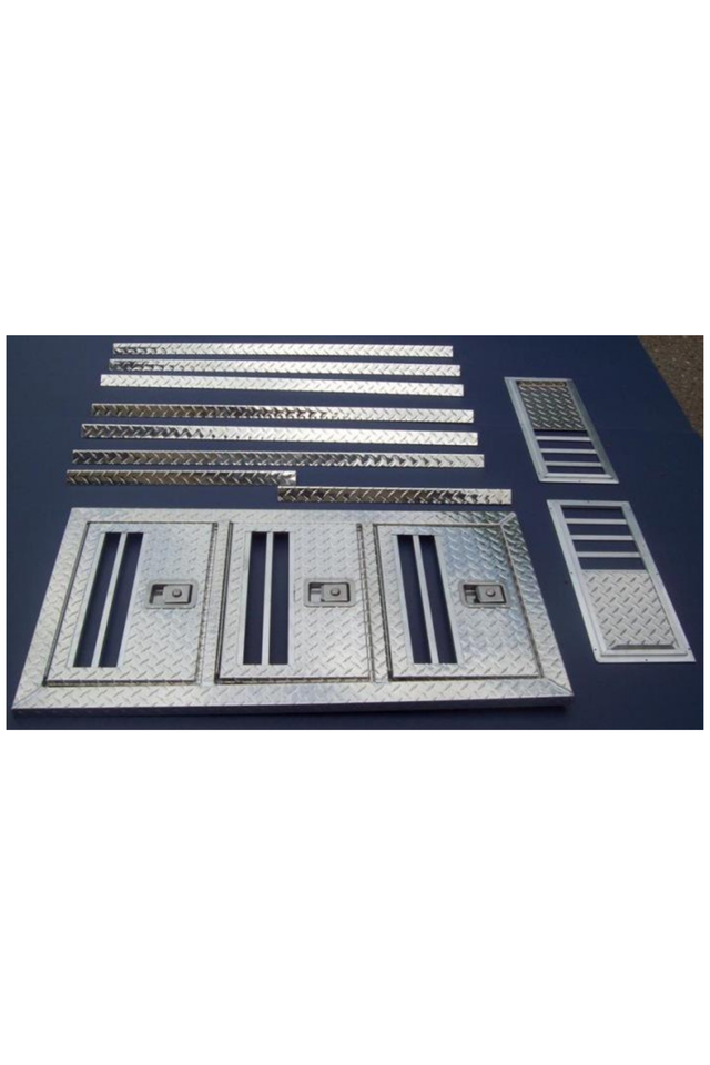 You provide the wood and wood screws to complete the Owens DIY Dog Box Kit. The kit contains a bolt pack, two 7" x 10" maximum flow side air vents, an aluminum front, 46"W, with a welded, rigid door frame to keep your box square and secure. Heavy-duty aluminum corners are included for durability. Storm door covers are included.
