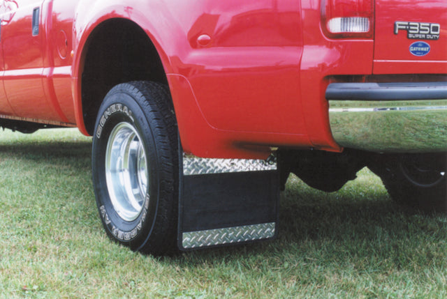 • Heavy duty rubber 19 inch x 24 inch mud flaps feature your choice of either diamond tread aluminum or polished stainless steel inserts for added strength and pizzazz