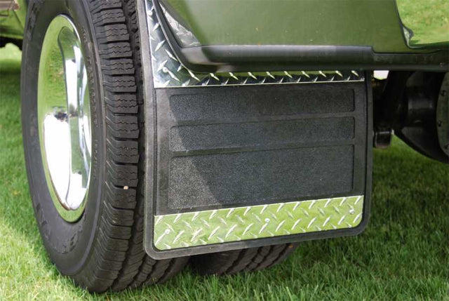 - Heavy duty rubber 19 inch x 24 inch mud flaps feature your choice of either diamond tread aluminum or polished stainless steel inserts for added strength and pizzazz