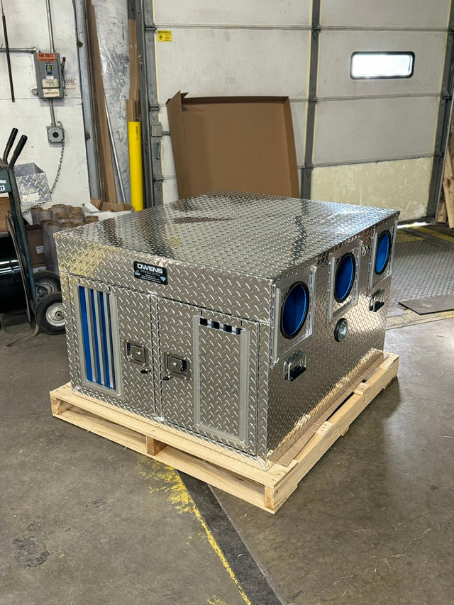 Our Hunter Series Dog Boxes feature a rugged diamond tread aluminum construction, large lined dog compartments with lockable slam latch doors, either with Standard Vents or All Seasons Vents for maximum air flow. Owens Products Hunter Series Dog Boxes are available in single, double or triple compartments, with or without top storage.