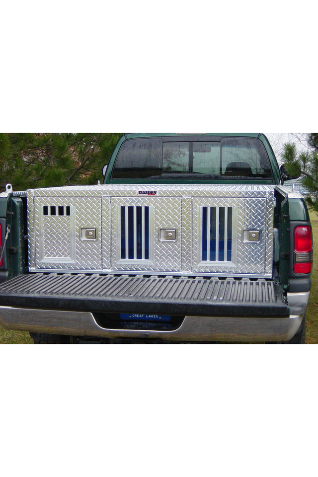 Our Hunter Series Dog Boxes feature a rugged diamond tread aluminum construction, large lined dog compartments with lockable slam latch doors, either with Standard Vents or All Seasons Vents for maximum air flow. Owens Products Hunter Series Dog Boxes are available in single, double or triple compartments, with or without top storage.