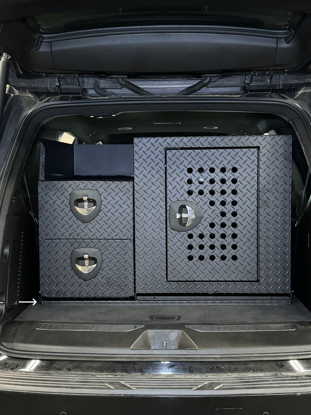 Professional K9 Rear Deployment Unit. Enhance your K9 unit’s efficiency and safety with our Professional K9 Rear Deployment Unit. Constructed from high-quality, heavy-duty materials, the Rear Deployment Unit features dual exit points for fast and versatile K9 deployment in any situation. Integrated side storage includes two spacious drawers equipped with reliable T-handle latches, keeping essential gear secure yet easily accessible.