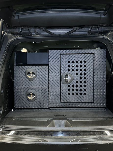 Dog Crate 55500 Professional K9 Series Rear Deployment Unit / Single Compartment / Side Drawer Storage / 45 W X 38 D X 31 H / Holes for Ventilation / Black / Diamond Tread Aluminum/ Owens Products